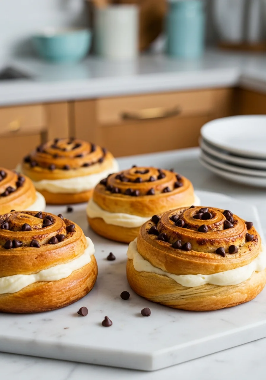 Soft, buttery brioches rolled with a silky vanilla cream and speckled with chocolate chip bursts, perfect for a cozy morning or an afternoon delight.